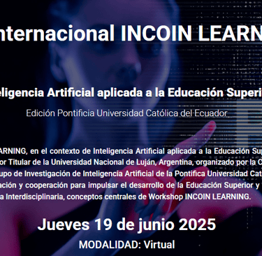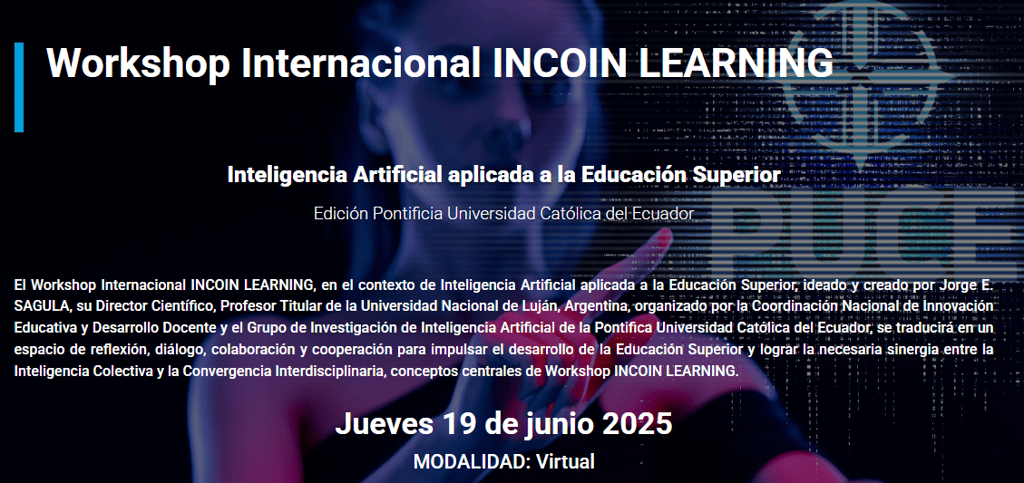 El Workshop Internacional INCOIN LEARNING, en el contexto de Inteligencia Artificial aplicada a la Educación Superior, ideado y creado por Jorge E. SAGULA, su Director Científico, Profesor Titular de la Universidad Nacional de Luján, Argentina, organizado por la Coordinación Nacional de Innovación Educativa y Desarrollo Docente y el Grupo de Investigación de Inteligencia Artificial de la Pontifica Universidad Católica del Ecuador, se traducirá en un espacio de reflexión, diálogo, colaboración y cooperación para impulsar el desarrollo de la Educación Superior y lograr la necesaria sinergia entre la Inteligencia Colectiva y la Convergencia Interdisciplinaria, conceptos centrales de Workshop INCOIN LEARNING.